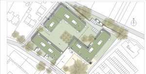 Neubau eines Wohnquartiers mit ca. 170 Wohneinheiten und KiTa • ca. 16.680 m² oi BGF • Bauherr: Instone Real Estate, Frankfurt • Architekt: Scharnberger Architekten