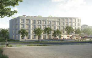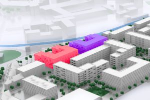Neubau eines Wohn- und Geschäftsgebäudes mit ca. 153 Wohnungen und einer KiTa auf einer eingeschossigen Tiefgarage • ca. 17.250 m² oi BGF • Bauherr: Instone Real Estate, Essen • Architekt: dirschl.federle_architekten, Frankfurt