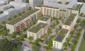 Neubau von 162 Wohnungen auf Baufeld 2 • Nachhaltiges Energiekonzept mit Effizienzhausstandard KfW 40 QNG-Plus, Wärmepumpe, Photovoltaik und Fernwärmeanschluss • Bauherr: Instone Real Estate Development GmbH, Leipzig • Architekt: KLM-Architekten und Ingenieure GmbH, Leipzig